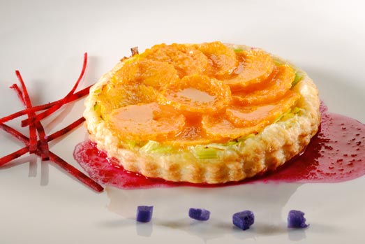 Fine tartelette feuilletée à l’émincé de poireau et Vacherin Fribourgeois AOP en rosace de courge, vinaigrette de betteraves rouges