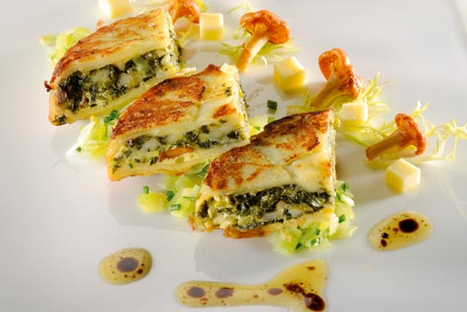 Galette de pommes de terre charlotte, chanterelles à l'émincé de poireau au Vacherin Fribourgeois AOP