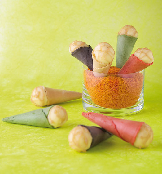 Déposer une petite cuillère de pâte sur une feuille de papier cuisson et étaler avec le dos de la cuillère afin d’obtenir des tuiles très fines. Enfourner et laisser cuire sans coloration. À la sortie du four, confectionner des petits cônes et laisser refroidir.