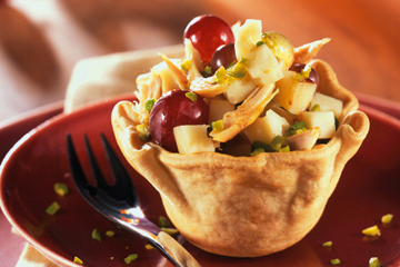 Démouler délicatement les paniers de pâte brisée, puis les remplir de la salade et saupoudrer des pistaches hachées avant de servir.
